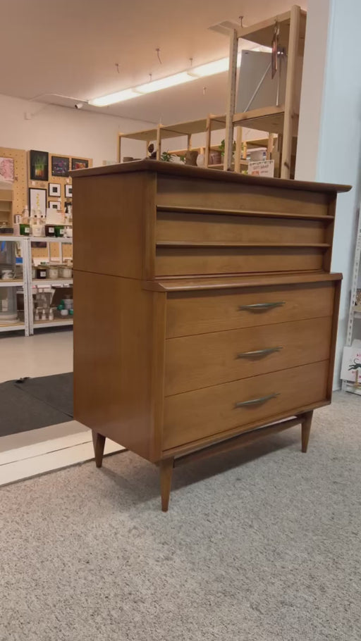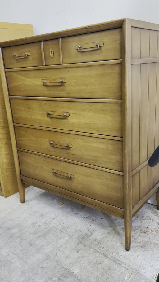 Low stockA walnut tall drawer dresser by United Furniture Company, circa. 1950. Fine craftsmanship with solid oak interior woods and dovetail construction....