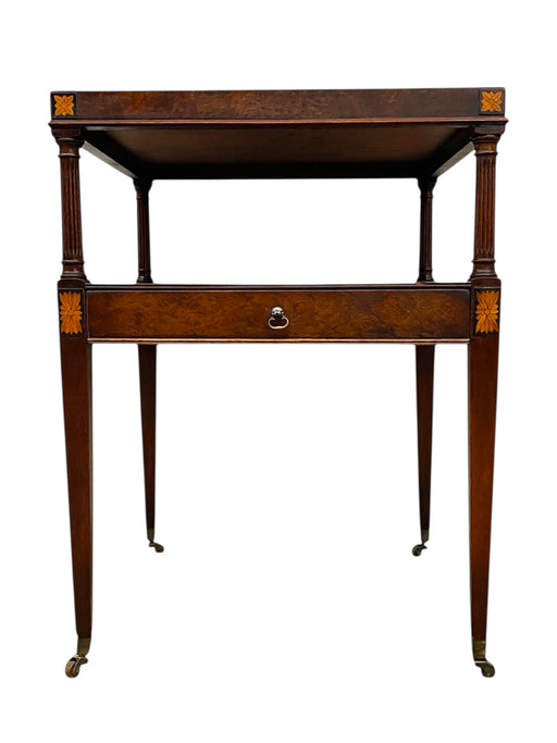 Vintage Iwo-Tier Side Table with Inlaid Top, Floral Marquetry Accents,and Brass-Toned Casters