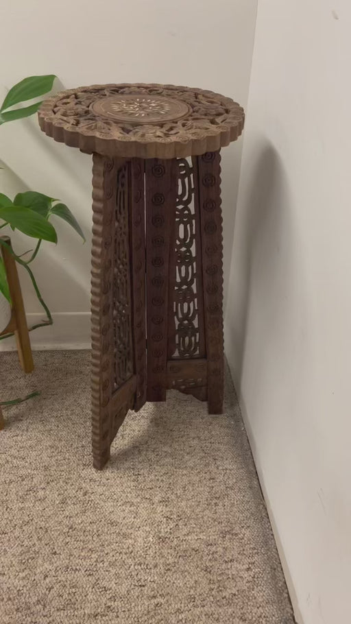 Hand Carved Indian Wooden Pedestal Side Table with Inlay, Folding Base and Removable Top