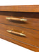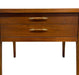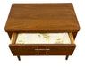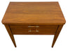 This vintage Mid-Century Modern end table features clean lines, tapered legs, and a warm wood finish characteristic of 1960s American design. The piece offers smoothly operating drawer, each fitted with brass-tone handles that add a subtle metallic accent without overpowering the simplicity of the form.