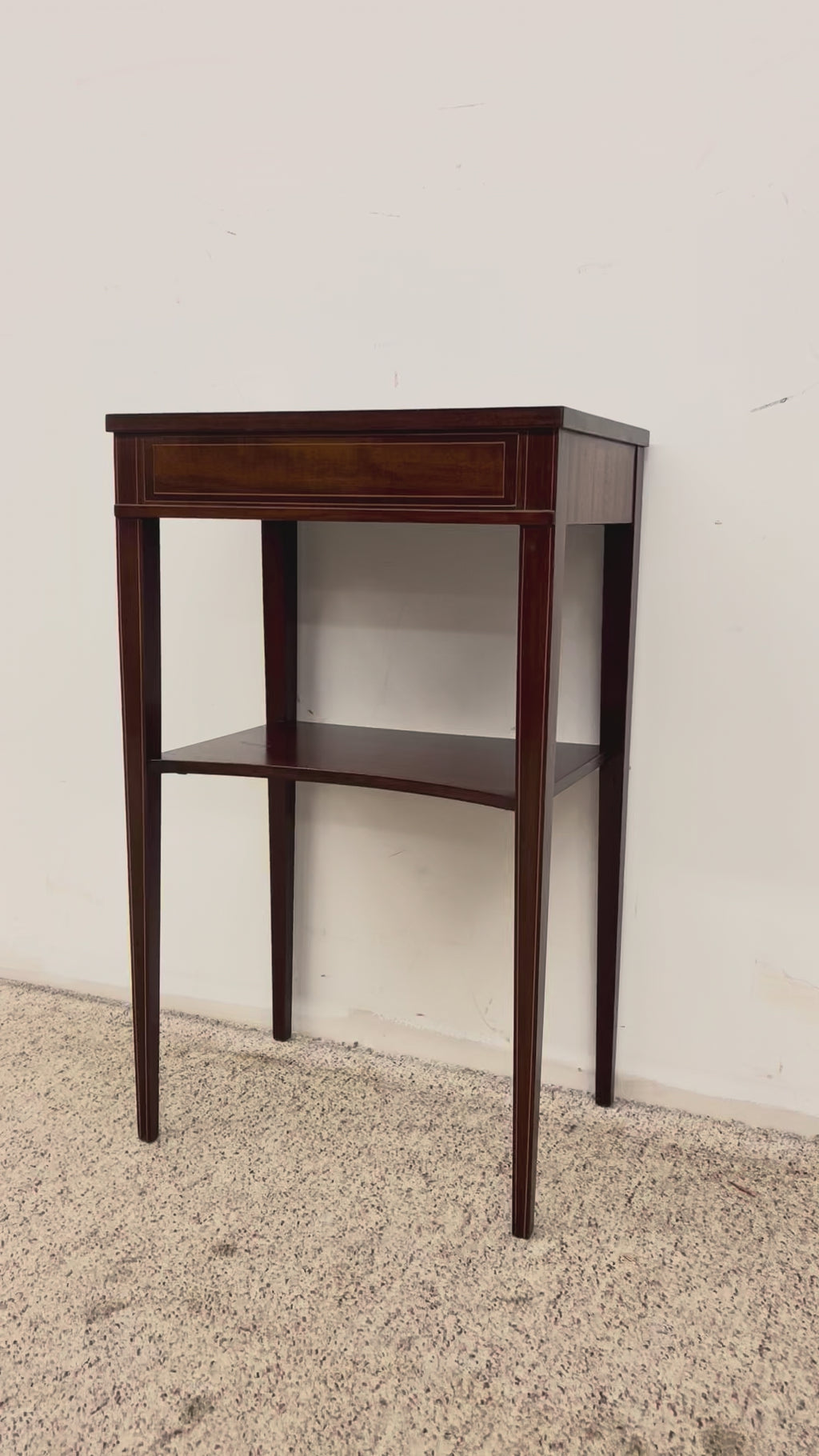 This vintage side table features elegant proportions, clean lines, and classic inlaid detailing throughout. The top surface is framed with fine line inlays that highlight the grain and provide a refined decorative border. Coordinating inlay work continues along the apron, adding visual depth and craftsmanship to the piece without overwhelming its simple silhouette.