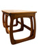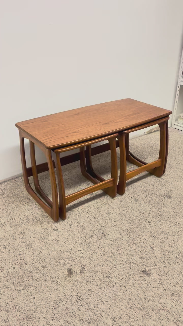 Each table is finely constructed with solid teak frames and veneered tops, highlighting the sleek profile and craftsmanship typical of Scandinavian design. The sculptural side panels provide both strength and a distinctive visual rhythm, allowing the set to function as a cohesive trio or individually throughout a room.A timeless and space-efficient addition to any mid-century modern interior.