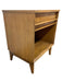 This vintage mid-century modern nightstand features clean lines, tapered legs, and a warm blonde finish. The design includes a single pull-out drawer with integrated molded wood pulls and an open lower shelf, offering both storage and display space.