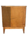 The nightstand sits on sturdy, angled legs that enhance its mid-century profile. The back panel is marked with stenciled production numbers, further attesting to its vintage authenticity.The piece shows light surface wear consistent with age and use, but remains in solid and functional condition.