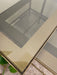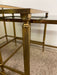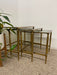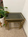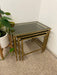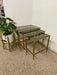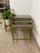 Elegant set of three mid-century modern nesting tables featuring smoked glass tops. Each table is designed with reeded, fluted legs and finely detailed accents, giving the set a sophisticated, neoclassical-inspired aesthetic. The smoked glass panels are inset into the frames, creating a sleek, reflective surface that complements the warm golden tones of the frame.
