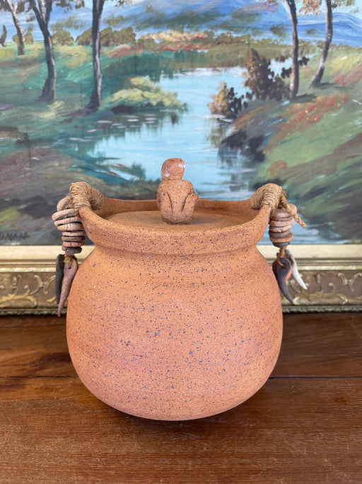 Handmade Indonesian Terracotta Lidded Jar with Beaded Raffia Accents and Seated Figure Finial