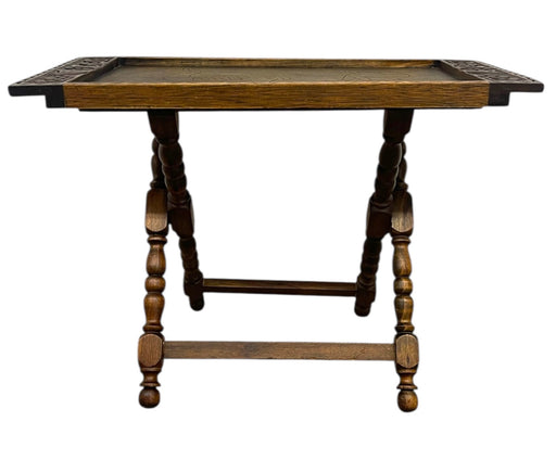 Low stockThis a hand-carved wooden serving tray paired with a coordinating folding wooden stand.The tray features a rectangular form with raised carved edge...