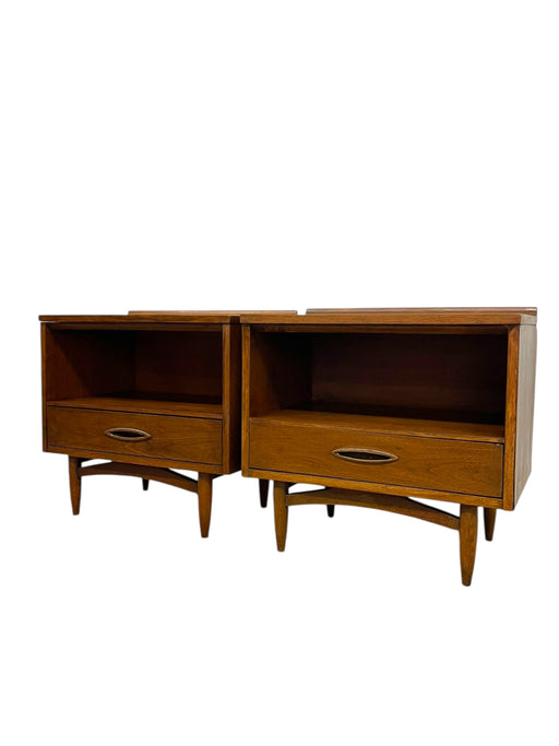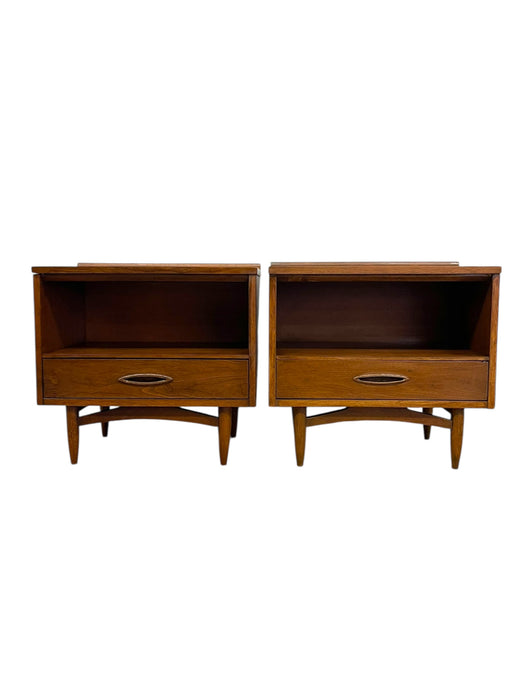 Mid-Century Modern Pair of Walnut-Toned End Tables with Open Shelf and Dovetail Drawer