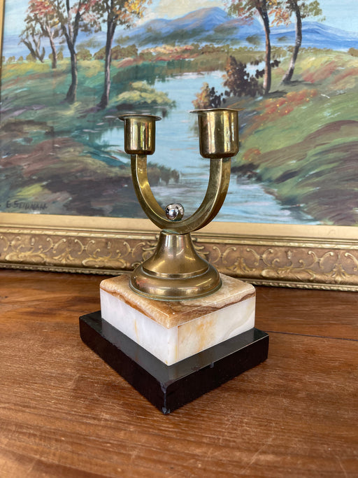 Vintage Brass Toned Double-Arm Candle Holder on Possibly Marble and Onyx Base