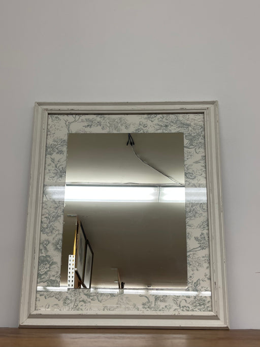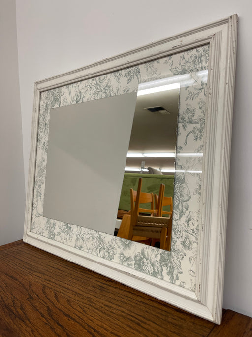 Vintage Floral Toile Mirror with Distressed White Wood Frame