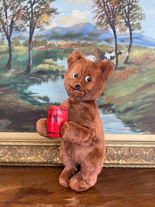 Low stockCharming mid-20th century plush bear toy, featuring soft brown fur and inset plastic eyes.The bear holds a painted red wooden barrel with a hand-pa...