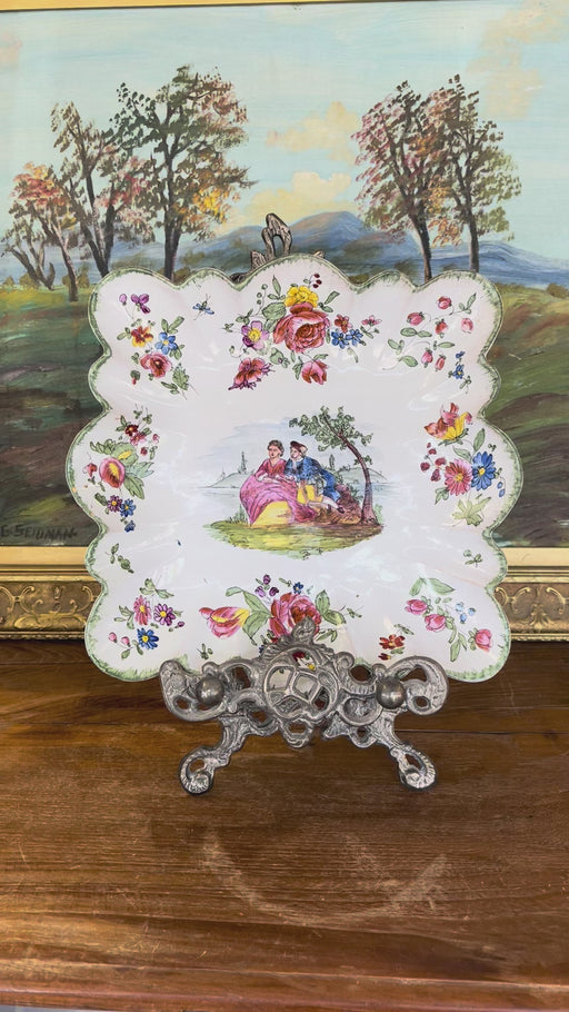 Low stockThis French possibly faience dish features a distinctive scalloped edge with hand-painted decoration.The central scene depicts a finely dressed cou...