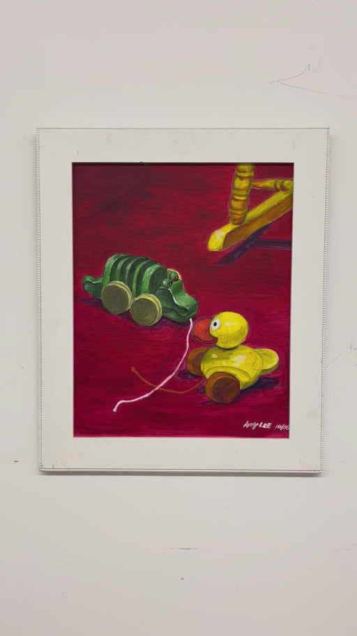 Low stockCharming and nostalgic,this original painting by artist Amy Lee (signed and dated 10/06) depicts two classic wooden pull toys - a green alligator a...