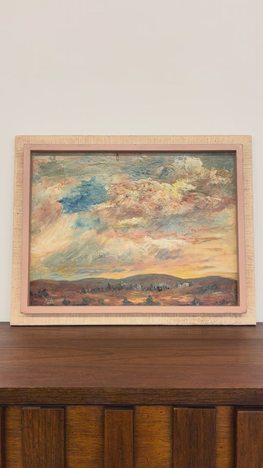 Vintage 1965 Landscape Painting Signed Woody - Mid-Century Textured Sky and Hills Scene in Original Frame