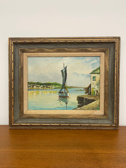 Low stockA charming vintage mid century painting depicting a serene coastal harbor scene, signed "Jay" in the lower right corner. The composition features a...