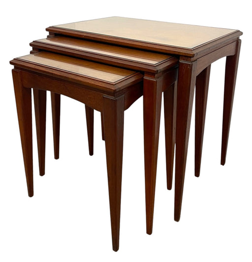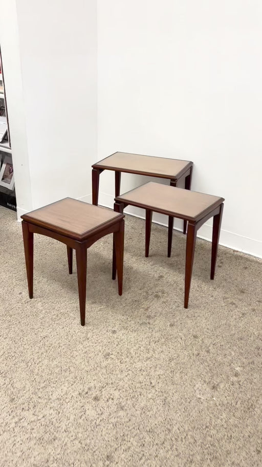 Low stockThis set of three mid century modern nesting tables features a clean, functional design with tapered legs and warm wood frames. The tables slide ne...