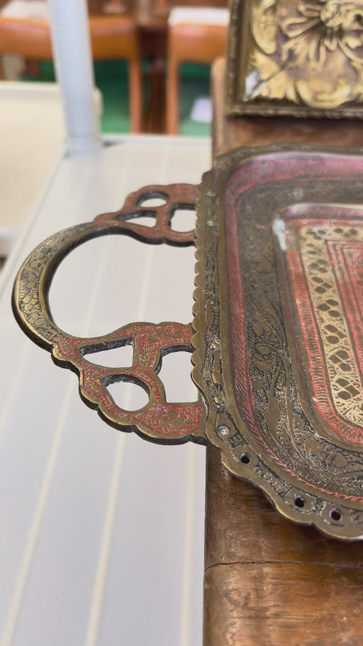 Low stockBeautifully crafted vintage rectangular serving tray featuring intricate hand-etched inlay work. The design showcases three elegant peacocks surrou...