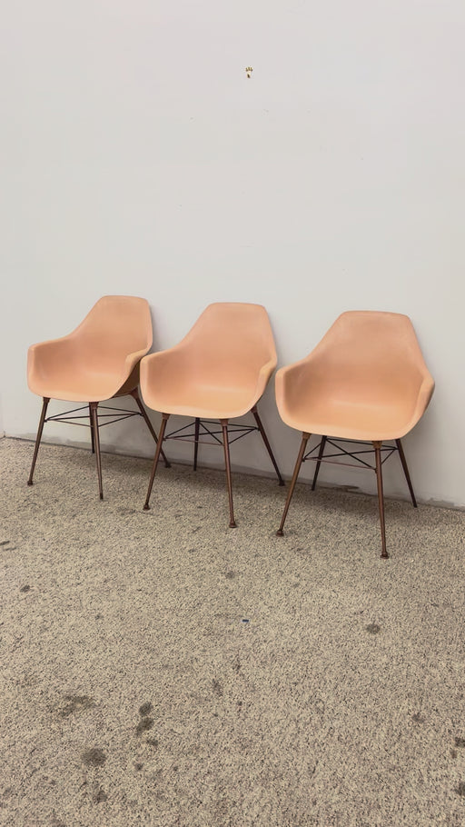 Set of 3 Vintage Mid-Century Modern Armchairs in Salmon Pink on Bronze-Toned Eiffel Bases
