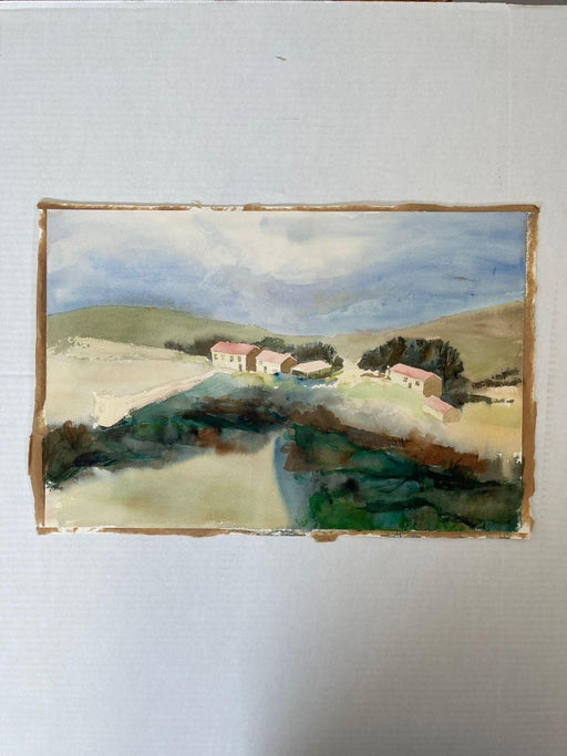 Low stockNature Landscape of Houses by Stream . Primary Colors are Green and Blue. Unsigned. Appears to Have Previously Been Framed due to Conditioning Ar...