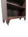 The sides have a subtle profile, complemented by arched cutouts along the base that give the silhouette a lighter appearance while maintaining durability. Small metal casters are fitted at the feet, allowing the unit to be moved more easily despite its substantial form. The darkened finish on the shelves and backboard reveals tool marks and patina that contribute to its rustic charm.