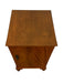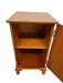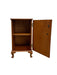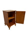 The single hinged door opens to a functional interior fitted with one fixed shelf, providing practical enclosed storage for bedside or accent use. The door is fitted with an ornate metal drop pull that adds a decorative focal point to the façade. Hinges and interior construction are visible and consistent with traditional cabinetmaking techniques.