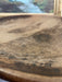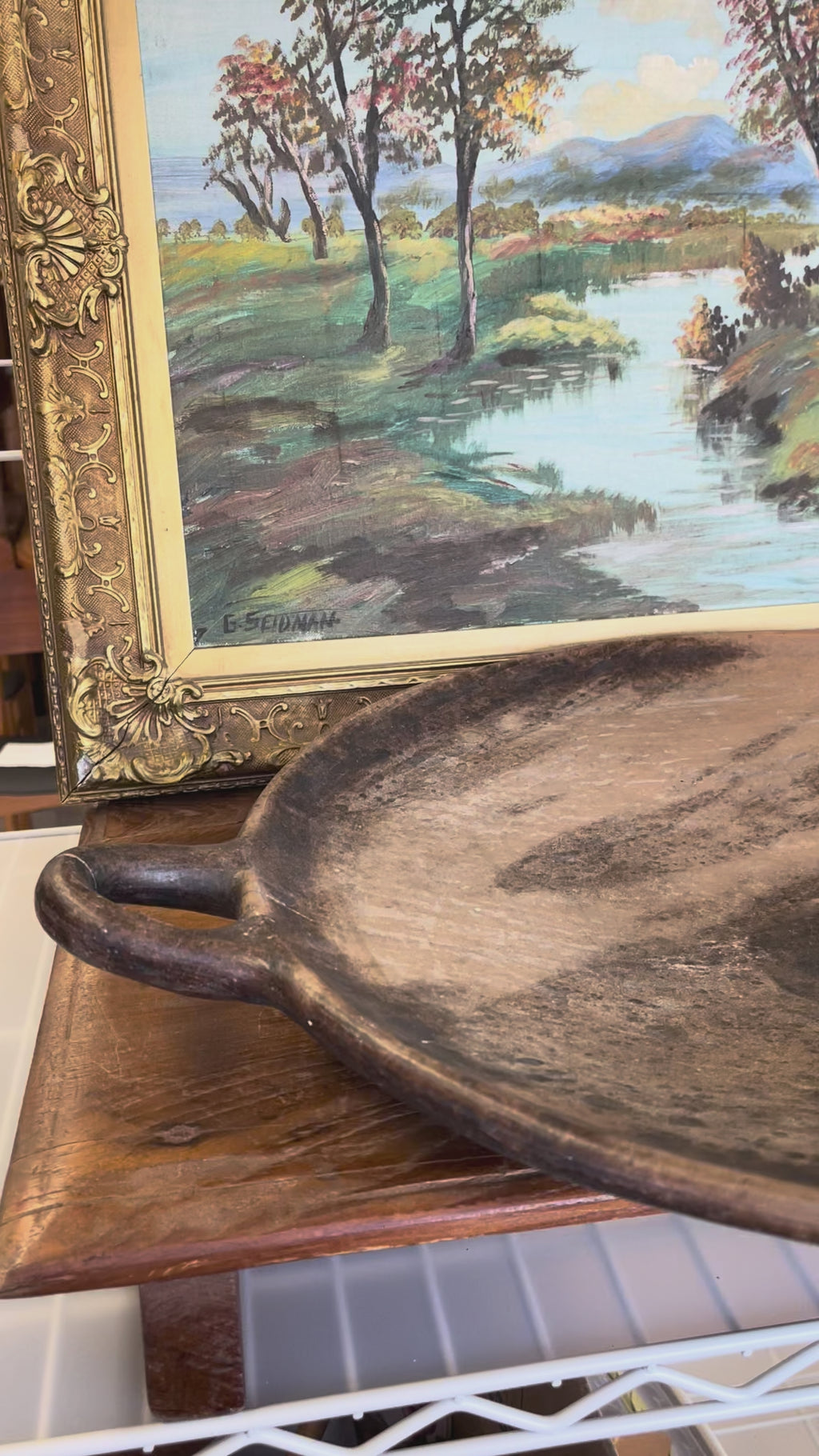 The griddle has a notable crack extending from one handle across the surface, visible in photographs, along with other age-related imperfections. Despite the damage, it remains a compelling artifact of early culinary craftsmanship and retains strong decorative and collectible appeal.Heavy wear, surface staining, and a structural crack (see photos). Sold as-is for display or collection.