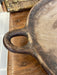 This possibly antique handcrafted clay griddle features a wide, shallow surface with two integrated loop handles. Made from earthenware, the piece shows heavy patina and surface wear consistent with age and traditional cooking use. The natural smoke-darkened finish and burn marks suggest it was historically used over open flame or hearth cooking, giving it a distinctive rustic character.