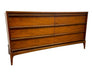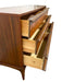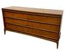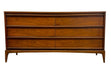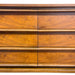 The exterior showcases warm wood tones with a natural grain pattern that runs consistently across the drawer fronts, contributing to the cohesive and understated aesthetic. The top surface provides generous display space, suitable for decorative objects, lighting, or functional use.This piece exemplifies Mid Century Modern design with its restrained ornamentation, practical storage, and focus on proportion and construction. Suitable for use as a credenza, sideboard, or low storage cabinet in a variety of interior settings.